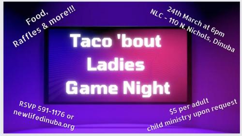 6:00 p.m. - NLC Women's Ministries "Taco 'bout Ladies' Game Night" - Dining Room