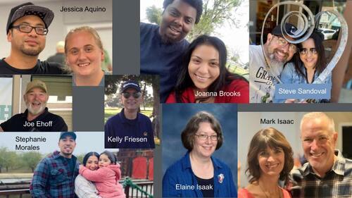 Clockwise from Top Left: Josh & Jessica Aquino (Children's Ministries Leader), Lafeyette & Joanna Brooks (Nursery Coordinator), Steve & Anatalia Sandoval (Youth Ministries Leader), Mark & Laurie Isaac (Lead Pastor/Elder), Elaine Isaak (Business Administrator), Kelly Friesen (On-call Business Administrator Assistant), Rosie Ann and Stephanie & Diego Morales