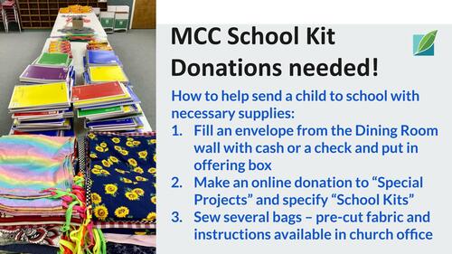 This is the last Sunday to contribute to MCC School kits