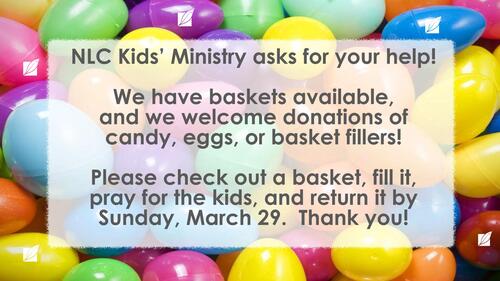 - Check out a basket and fill it with candy, eggs, or basket filler items, and pray for the kids before returning it by Sunday, March 29.
