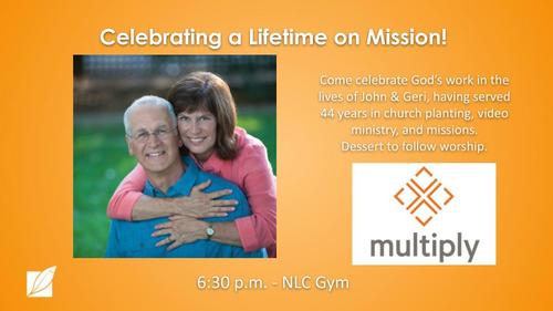 6:30 p.m. Celebration of John & Geri's 44 years of mission work around the world